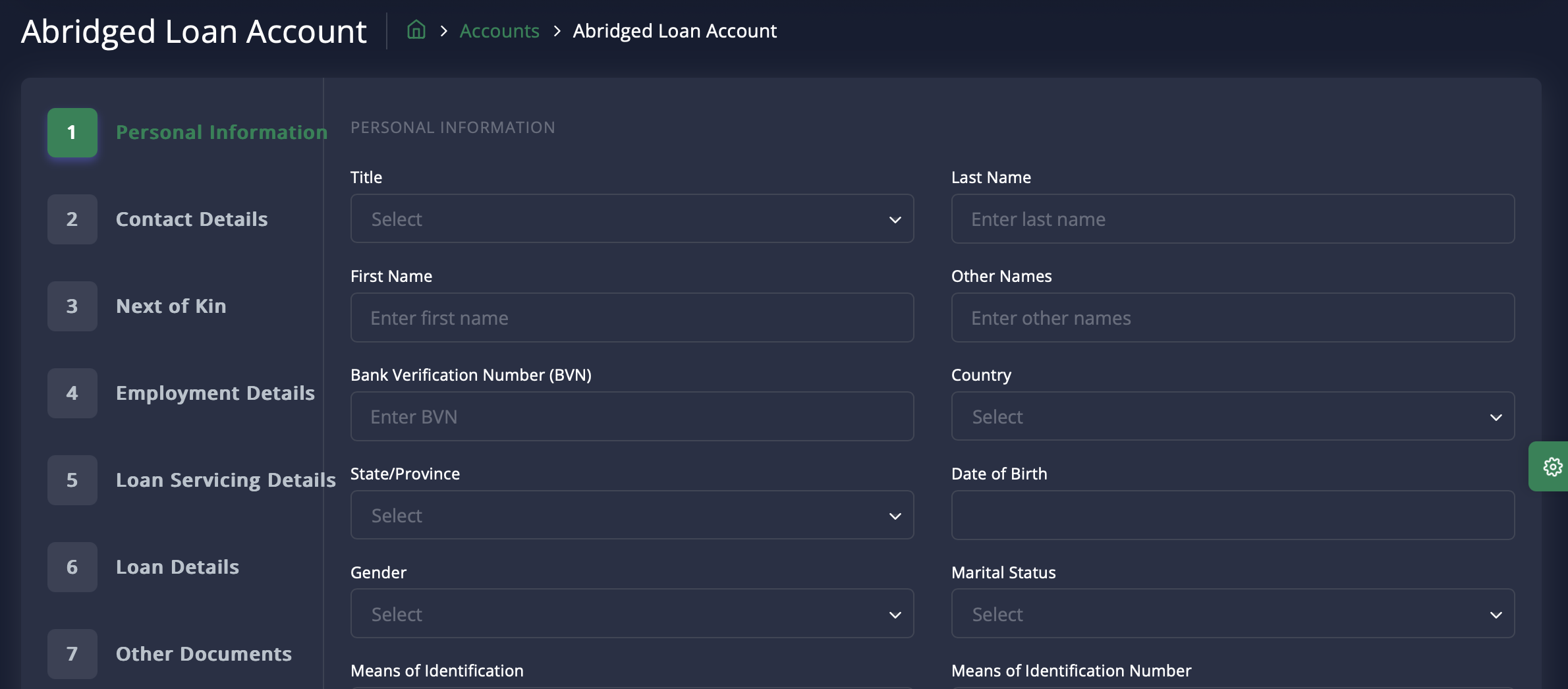 Abridged loan accounts enable you to process loans quickly and efficiently. This menu allows you to capture all the requirements to create a customer ID, create a repayment linked account and to create a loan account in a single flow. This menu is only applicable to new to the bank customers. This section will walk you through managing abridged loan accounts within the Udara360 CBA system.