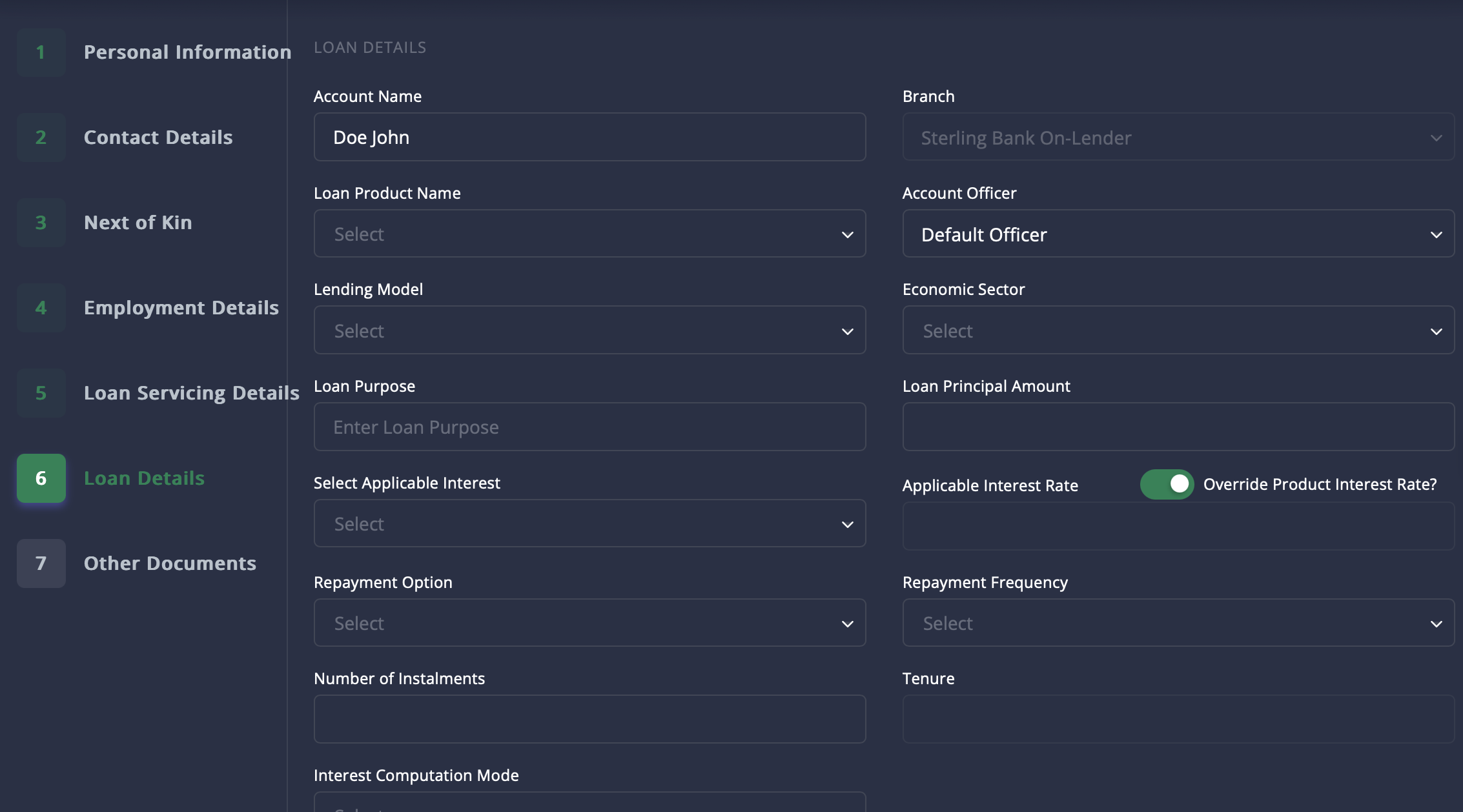* **Override Product Interest Rate?:** Indicate if you want to override the default interest rate for the loan product.