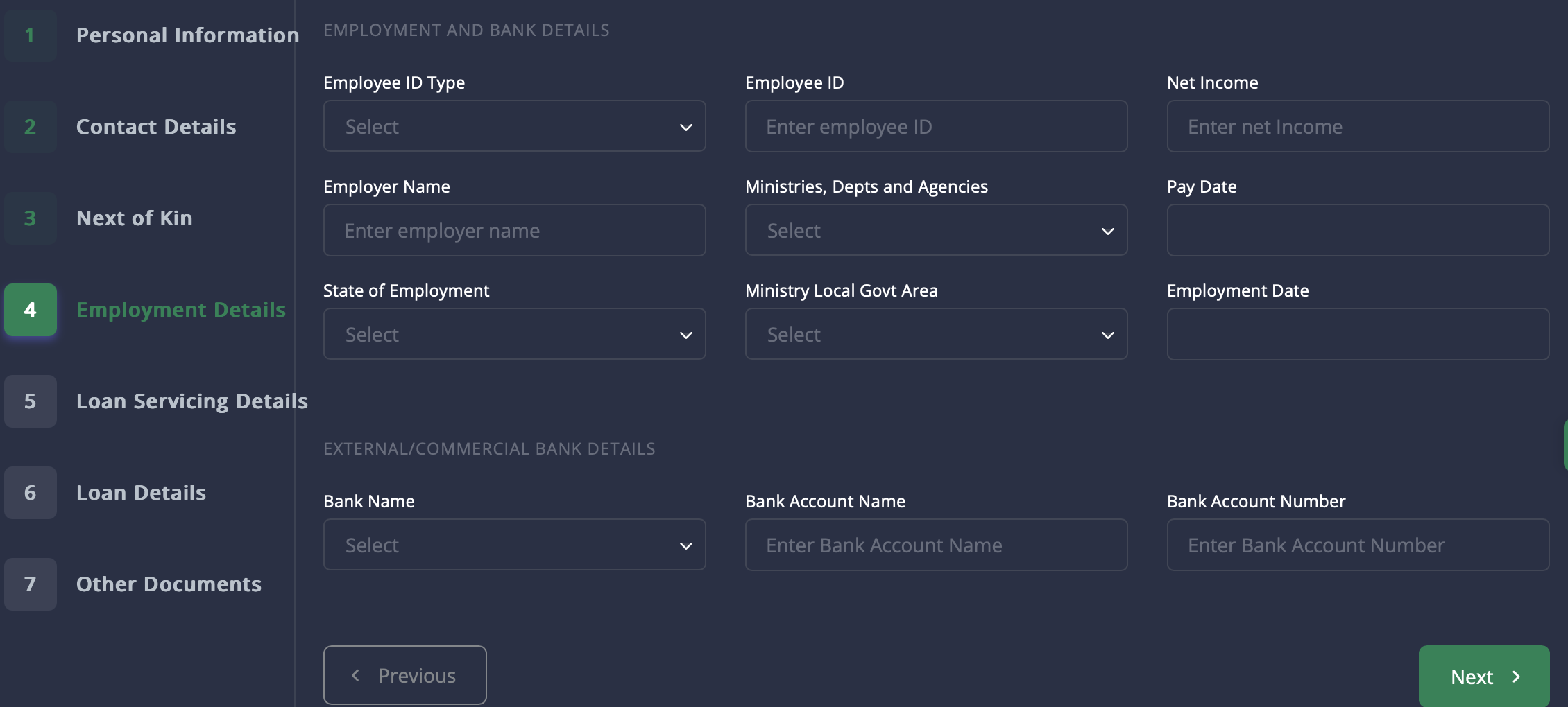 **Step 4:** Input your borrower's **Employment Details**. The following information includes **Employee ID Type:** Select your employee ID type (e.g., Private Staff ID, Oracle Number).