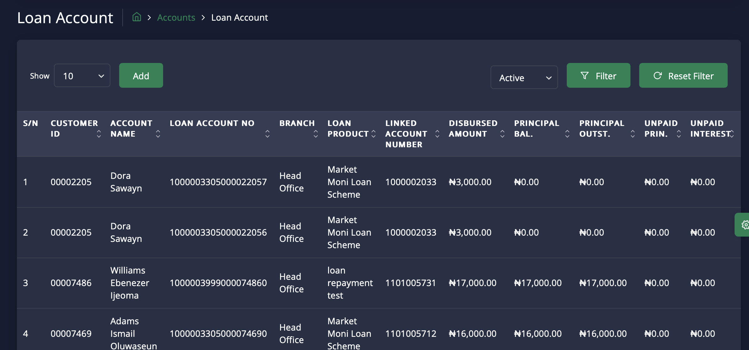Input your search criteria. You can search by Account Name, Customer ID, Reference Number, Account Officer, Loan Account Number, IPPIS/Oracle ID, Loan Product, Loan Disbursed, Branch or loan Status.