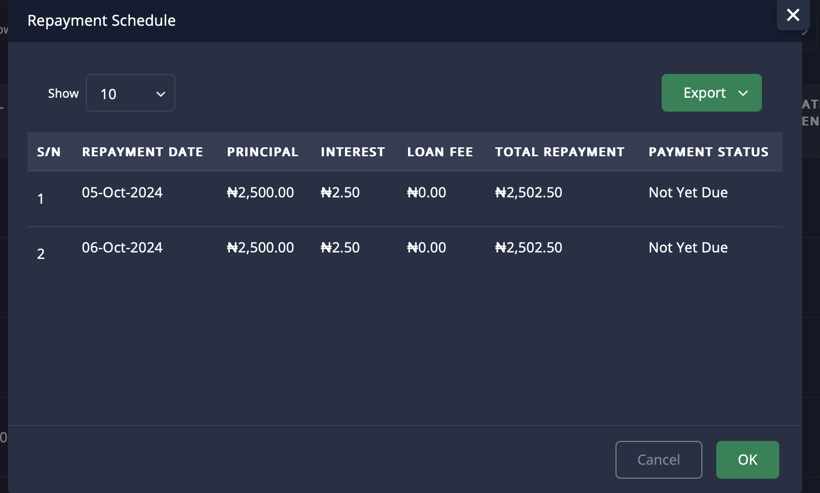 Navigate to any Repay Loan tab to see a breakdown of all payments made, including the date, amount paid, and remaining balance.