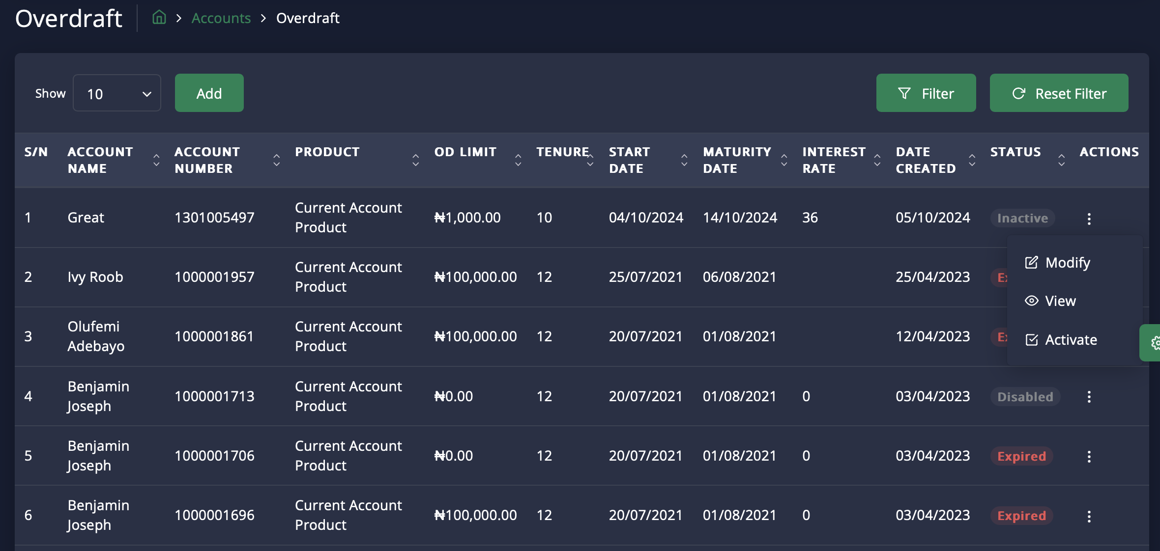 The Overdraft page lets you oversee and control customer account overdraft facilities. An overdraft is a credit line granted to account holders, allowing them to withdraw more than what is available in their accounts within the limits of the overdraft. This page allows you to monitor, modify, activate, and view overdraft accounts and track important details such as tenure, interest rates, and maturity dates.