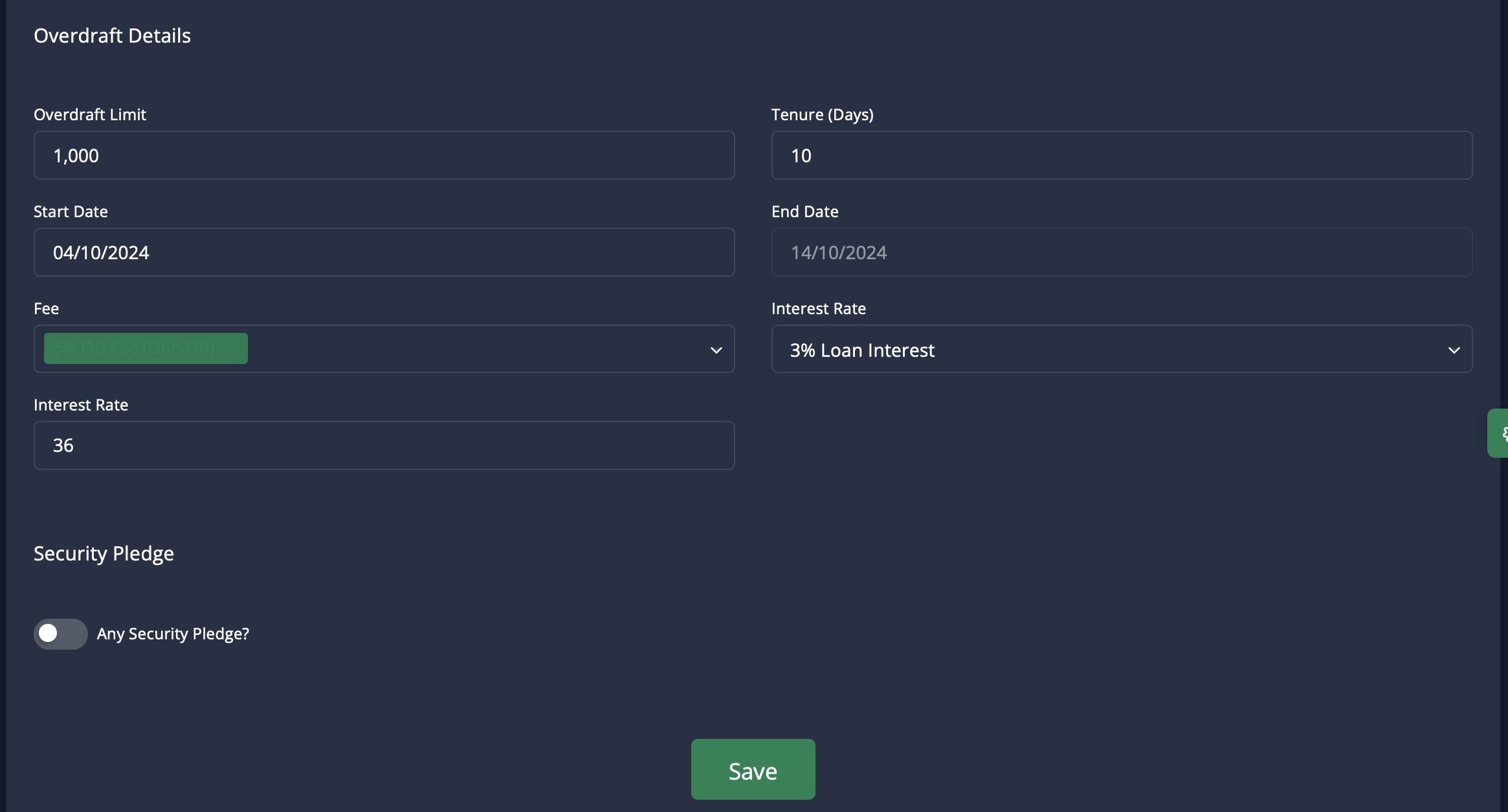 3. Make the necessary updates, such as changing the **Overdraft Limit**, **Tenure**, or **Interest Rate**.