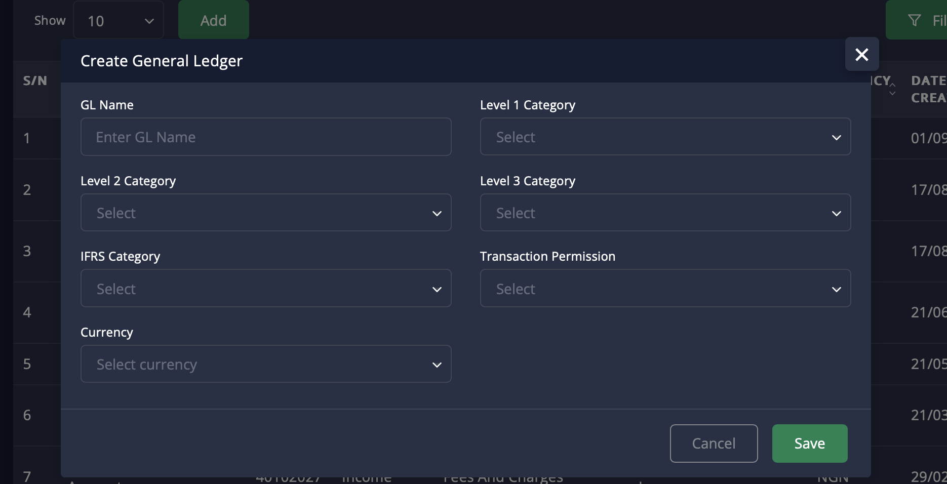 The General Ledger (GL) page enables you to manage all accounting transactions that impact the institution's financial records. You can view, create, modify, and track general ledger accounts for various operations, ensuring accurate financial reporting.