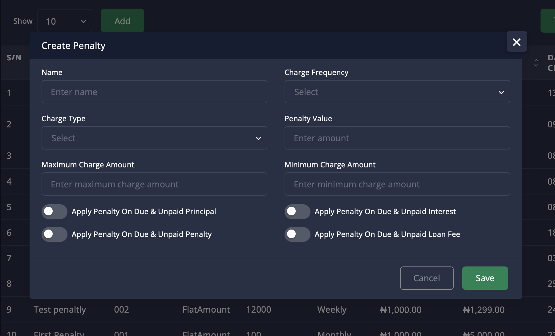 Name: Enter a descriptive name for the Penalty (e.g., “Loan Overdue Penalty”).