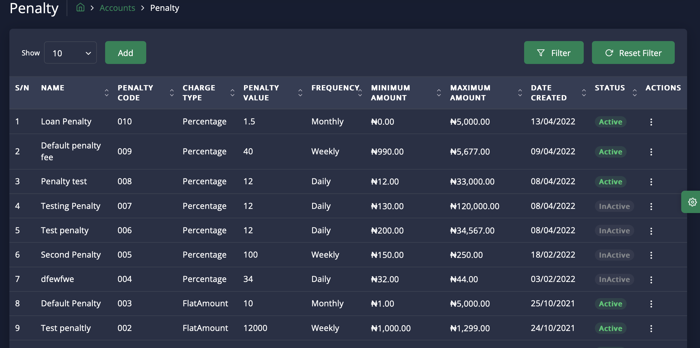 The Penalty Page allows you to set up and manage penalty fees for overdue payments or breaches of financial agreements, such as loans or credit accounts. You can define penalties with various configurations, such as charging for overdue principal, interest, or other components.