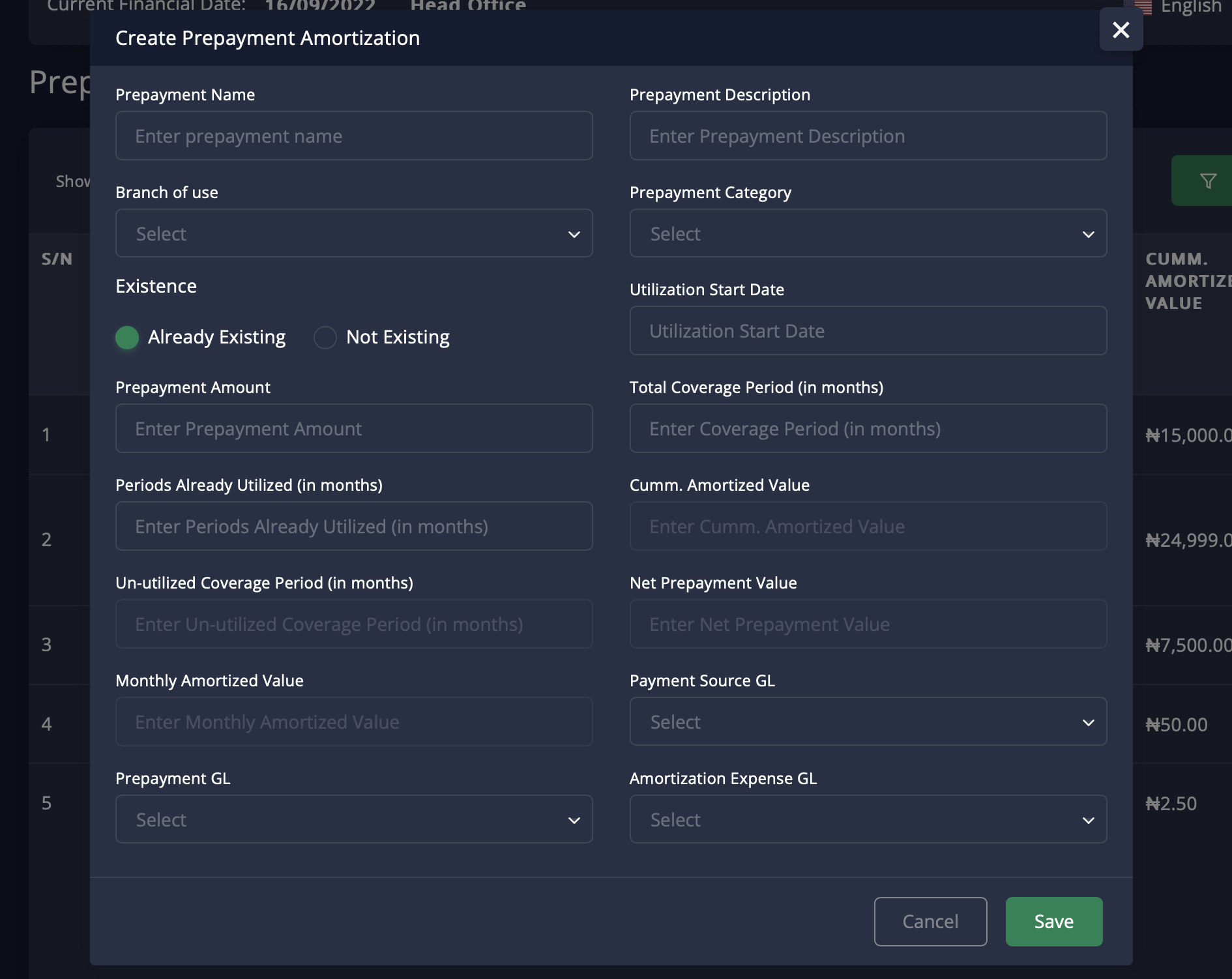 Where toggle is set to Already Existing, it is very important that the data inputer key-in the accurate period already utilized as well as the accurate cumulative amortized value to date.\