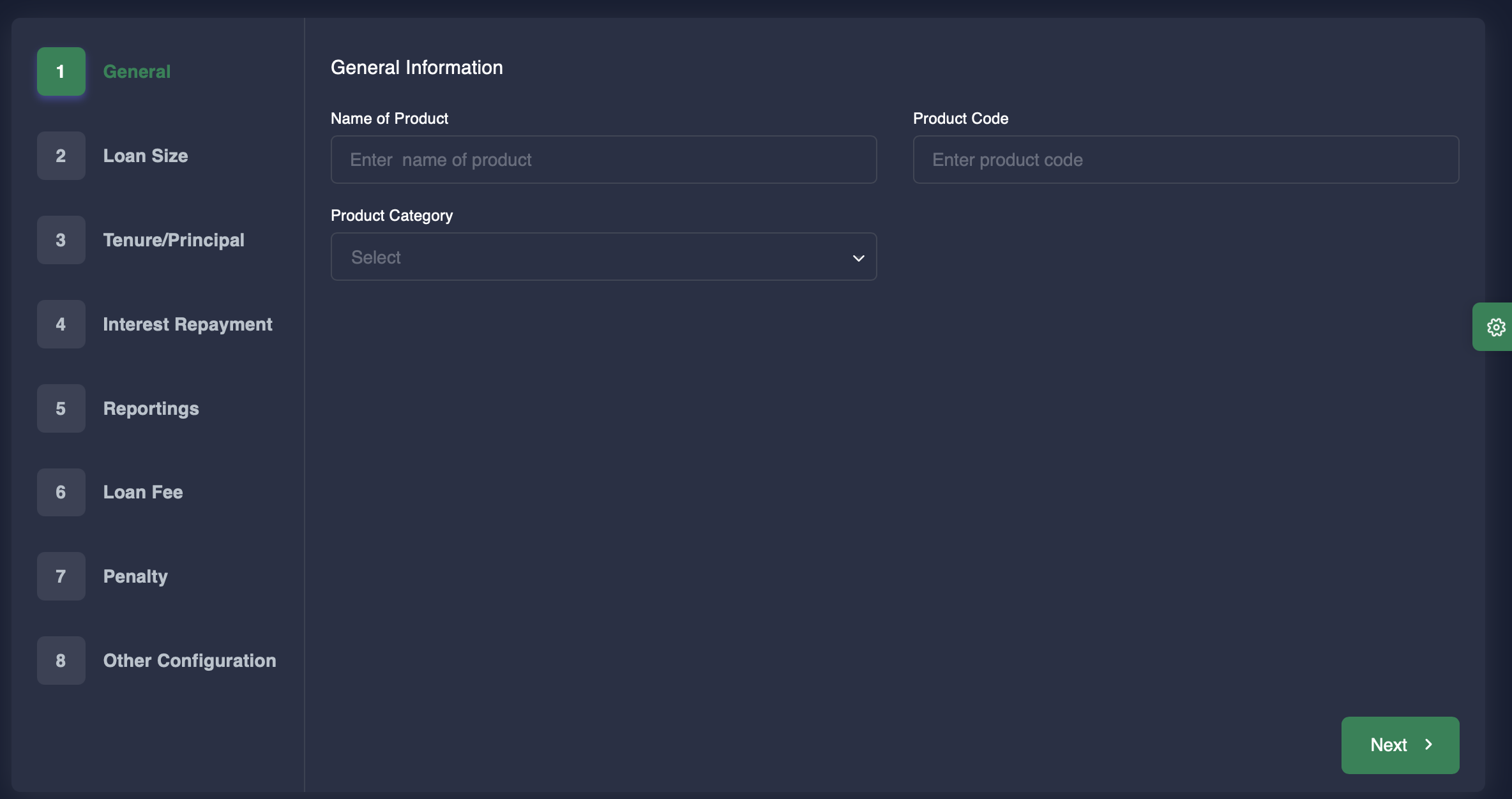 <figure><img src="https://4148303057-files.gitbook.io/~/files/v0/b/gitbook-x-prod.appspot.com/o/spaces%2FxJO1GSxhJIrS0metPeFt%2Fuploads%2FfT7IgqAhD2K5cjE6SsuF%2FCreate%20Loan%20Product.png?alt=media&#x26;token=73d35ce3-2bbb-42e2-8aa9-9b771137a3c5" alt=""><figcaption></figcaption></figure>