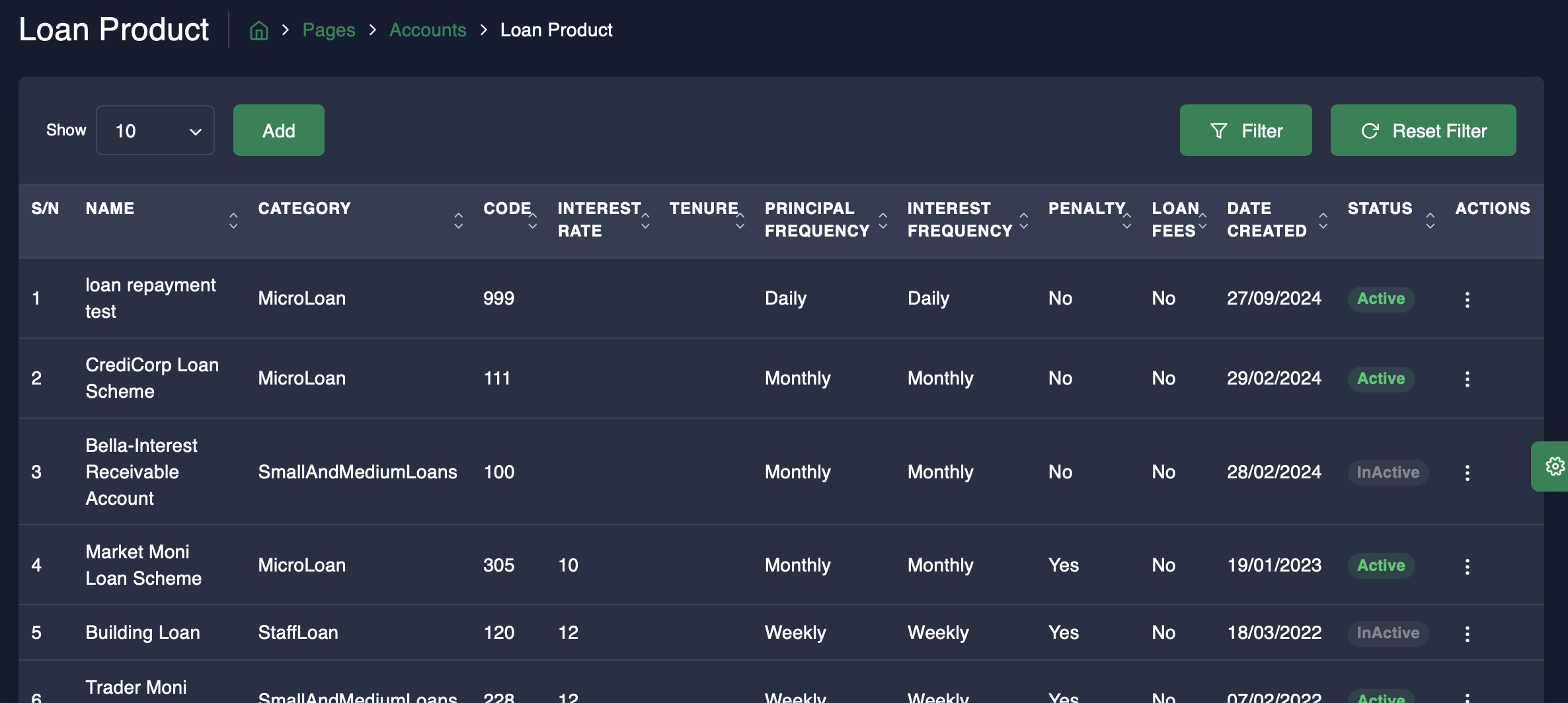 The Loan Product page lets you create, manage, and configure different loan products your financial institution offers. It allows you to define loan terms, interest rates, repayment schedules, and associated fees with flexibility. The page lets you link loan products to the appropriate General Ledger (GL) accounts for accurate financial tracking.