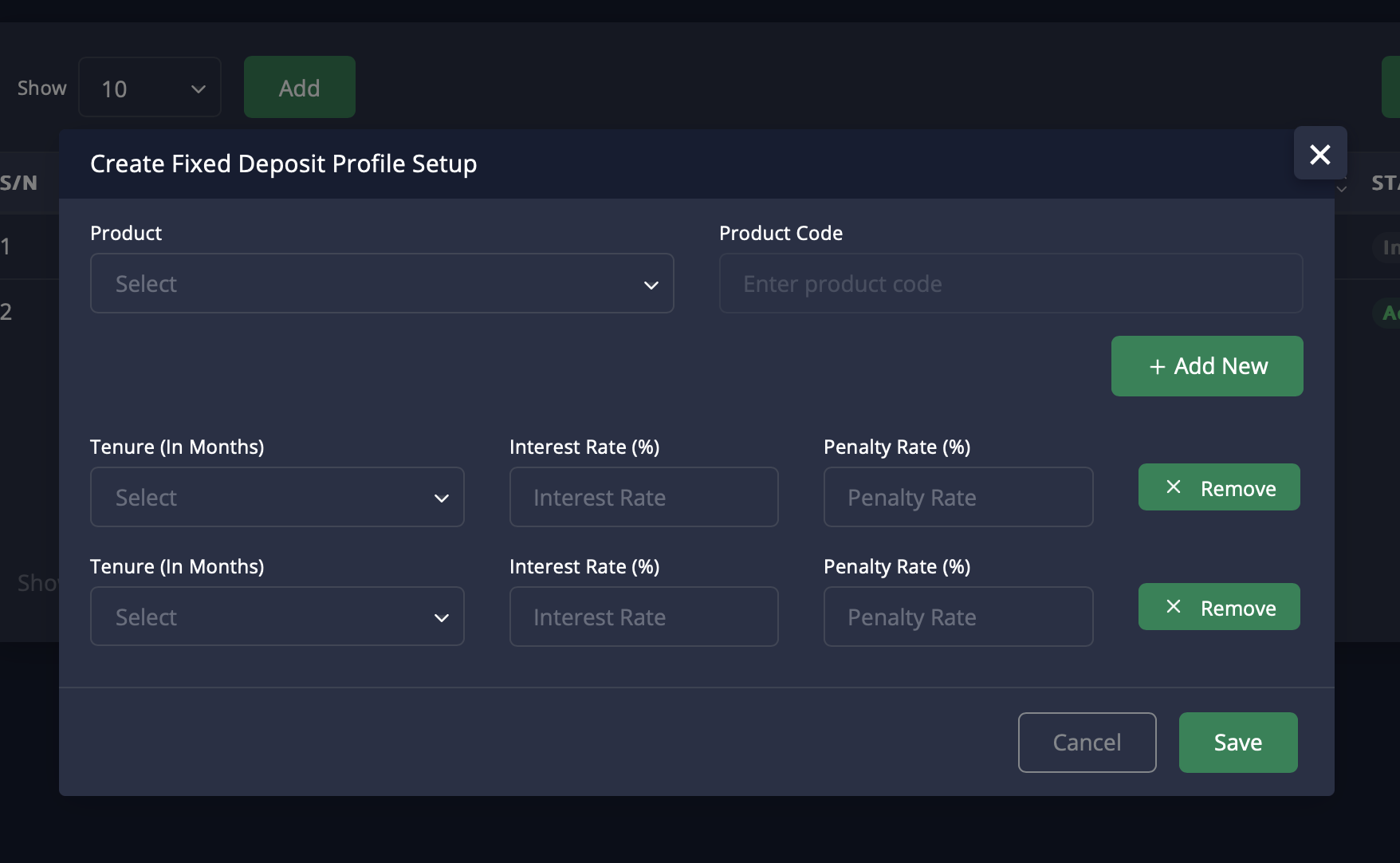 The Fixed Deposit Profile Setup page allows you to configure fixed deposit products by setting their tenure, interest, and penalty rates. This page helps streamline the setup process, ensuring