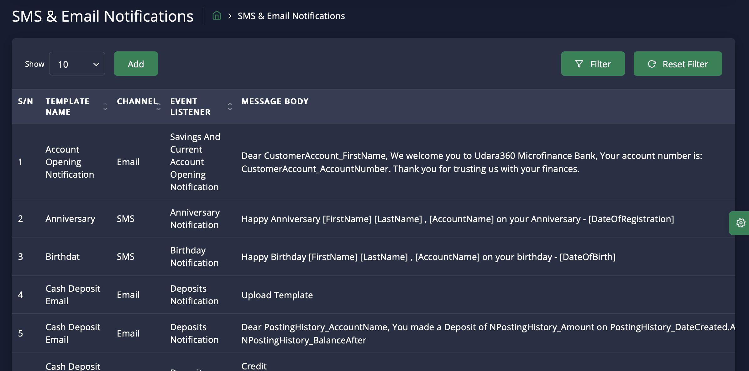 The SMS & Email Notifications page configures and manages the various notifications and alerts that the system sends to customers and bank staff via SMS and email. These notifications can be triggered by specific events within the banking system, such as account opening, loan approval, or transaction alerts.