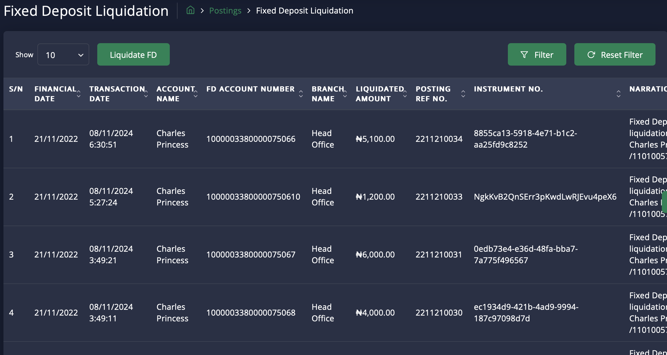 The Fixed Deposit Liquidation page processes the early liquidation of fixed deposit accounts. This page allows you to select the fixed deposit account to be liquidated and initiate the liquidation process.